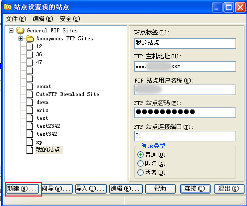 | 3,我站點設(shè)置中點“新建”,站點標(biāo)簽任意設(shè)置一個名字,F(xiàn)TP主機(jī)地址填自己的域名; 填入ftp站點用戶名稱和密碼,ftp連接口用默認(rèn)的21,登錄類型選擇為“普通”。